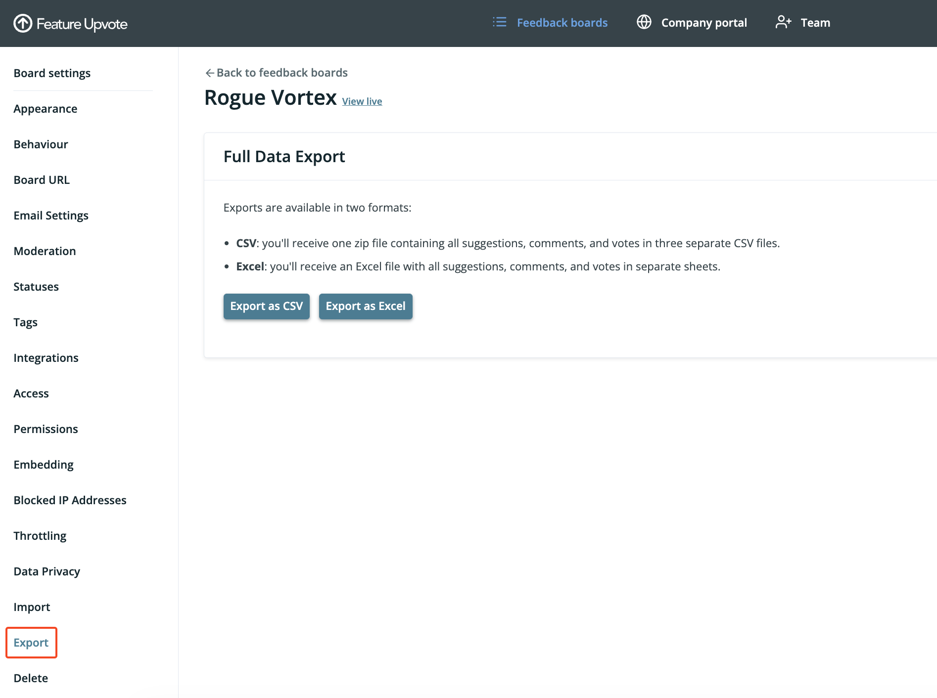 You can export your board’s suggestions, comments, and votes in CSV format, suitable for use with other applications. You can also export in Excel format. You might want to do this because: