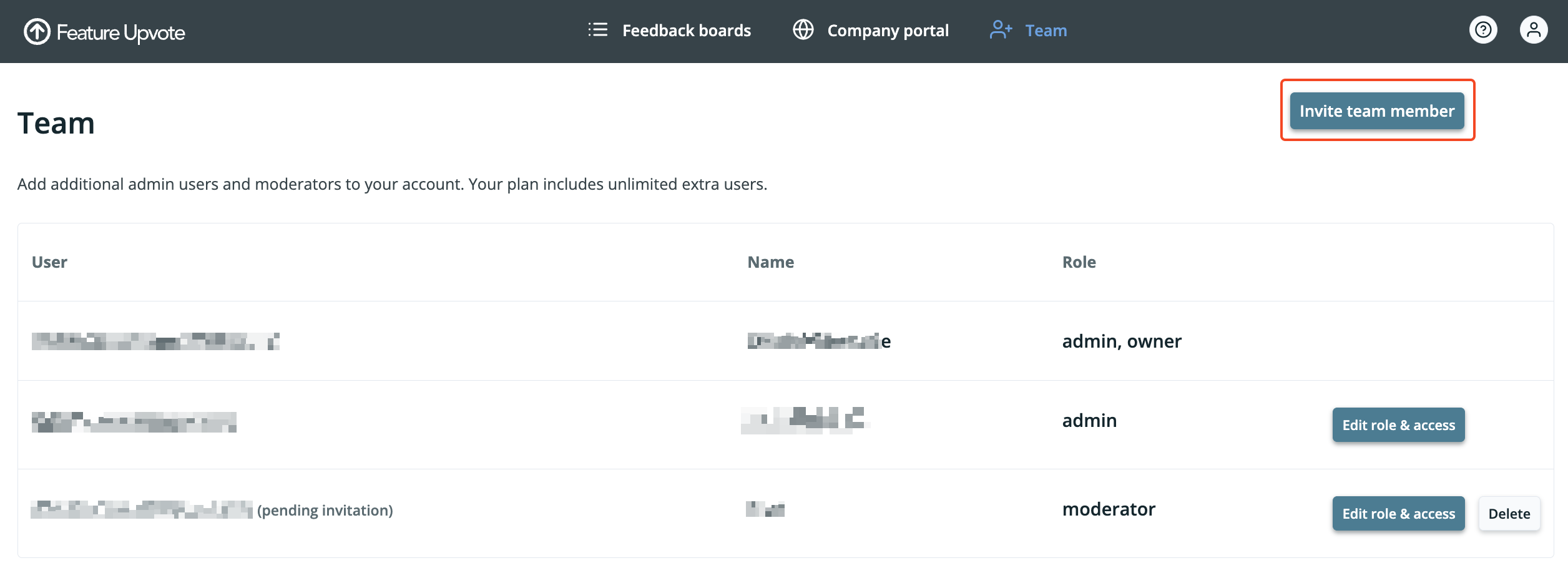 Then you’ll see your Team page. You have the option of adding a new team member who has full access to your account, or who can moderate suggestions and comments only.