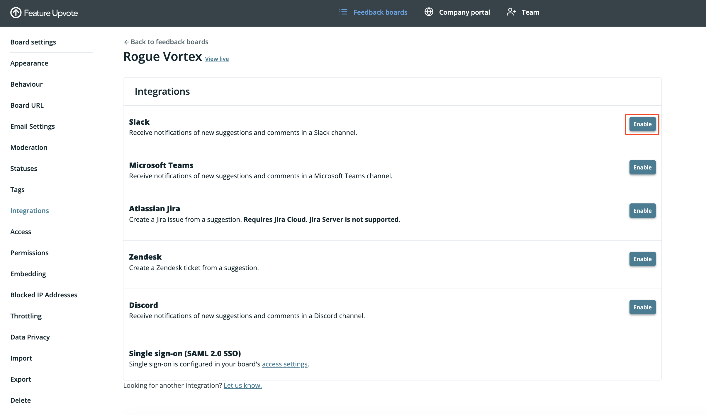 - From your Feature Upvote dashboard, go to Feedback Boards > Settings > Integrations, find Slack and click Enable.