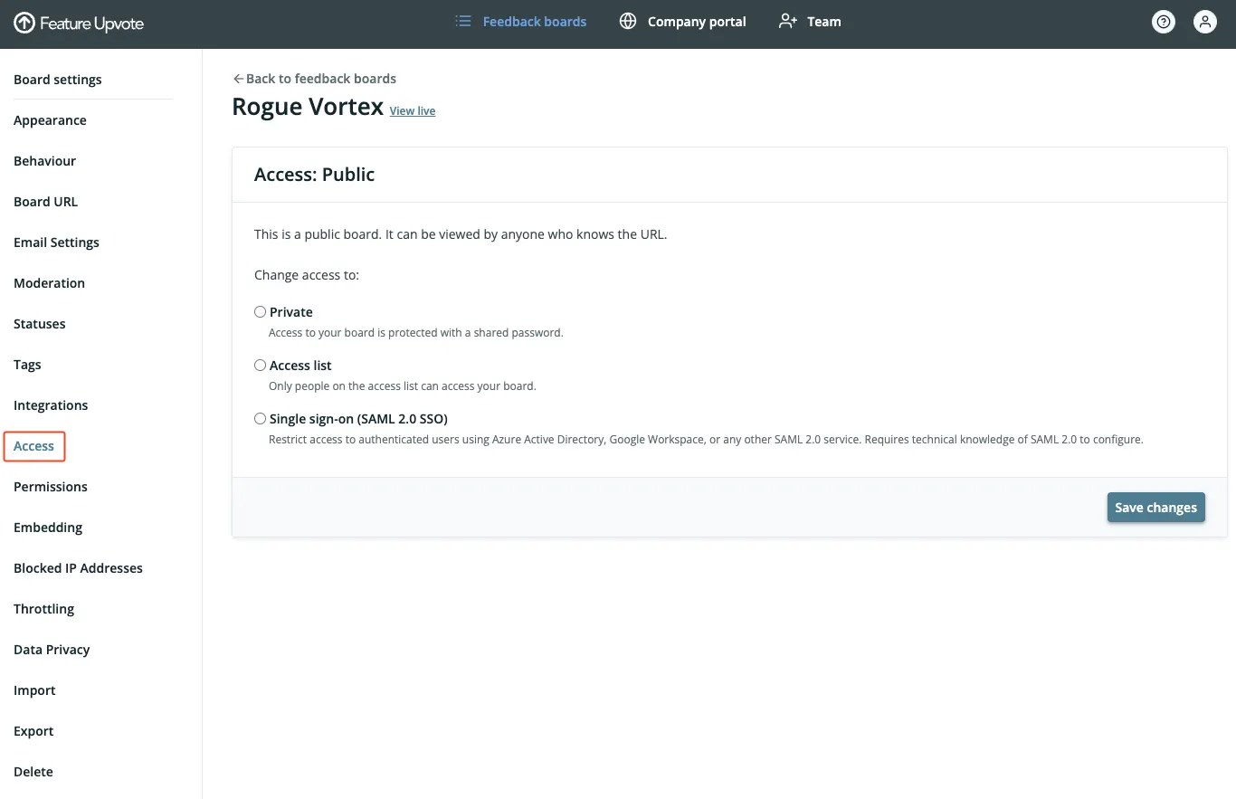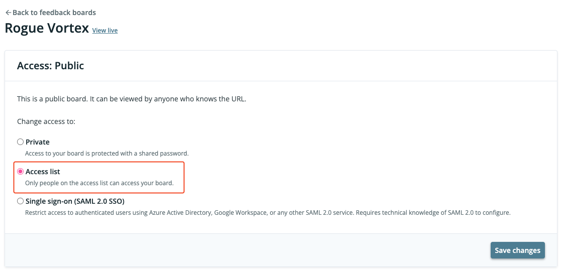 By default, your feedback board is publicly visible. Instead you can restrict access to a specific set of people, identified by their email address.