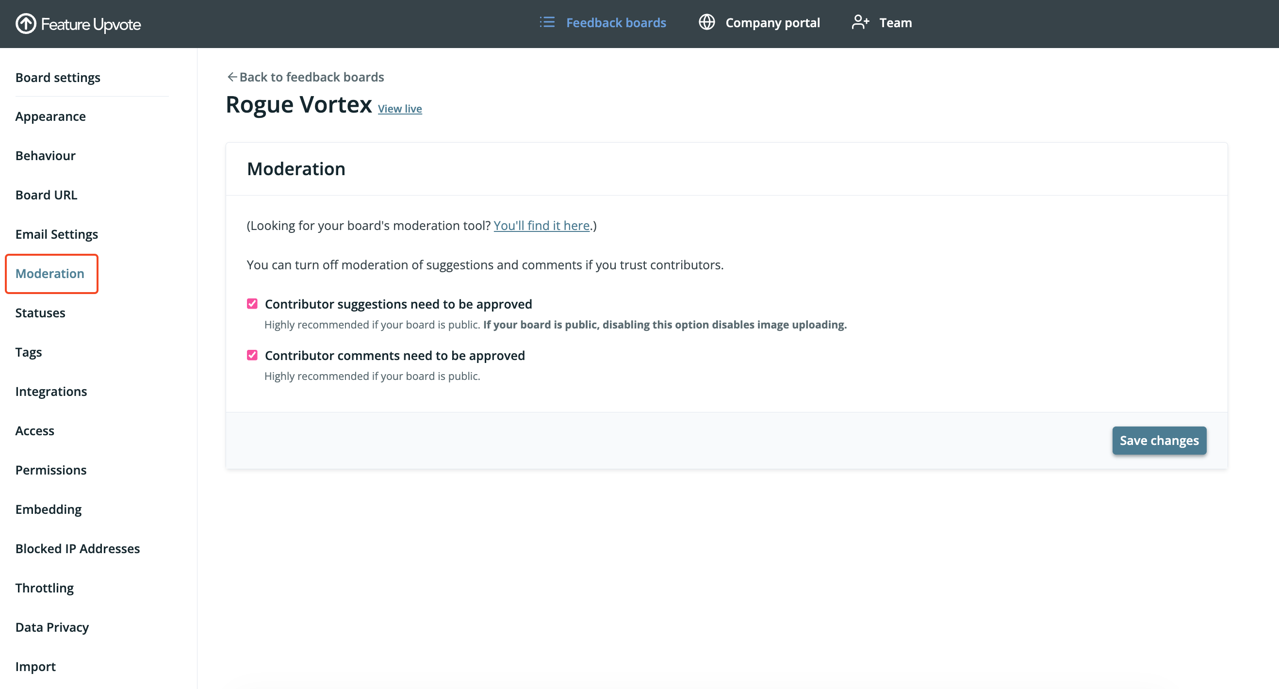 - You have a private feedback board (password-protected or with Single Sign-On) so contributors have already been vetted and extra moderation is unnecessary