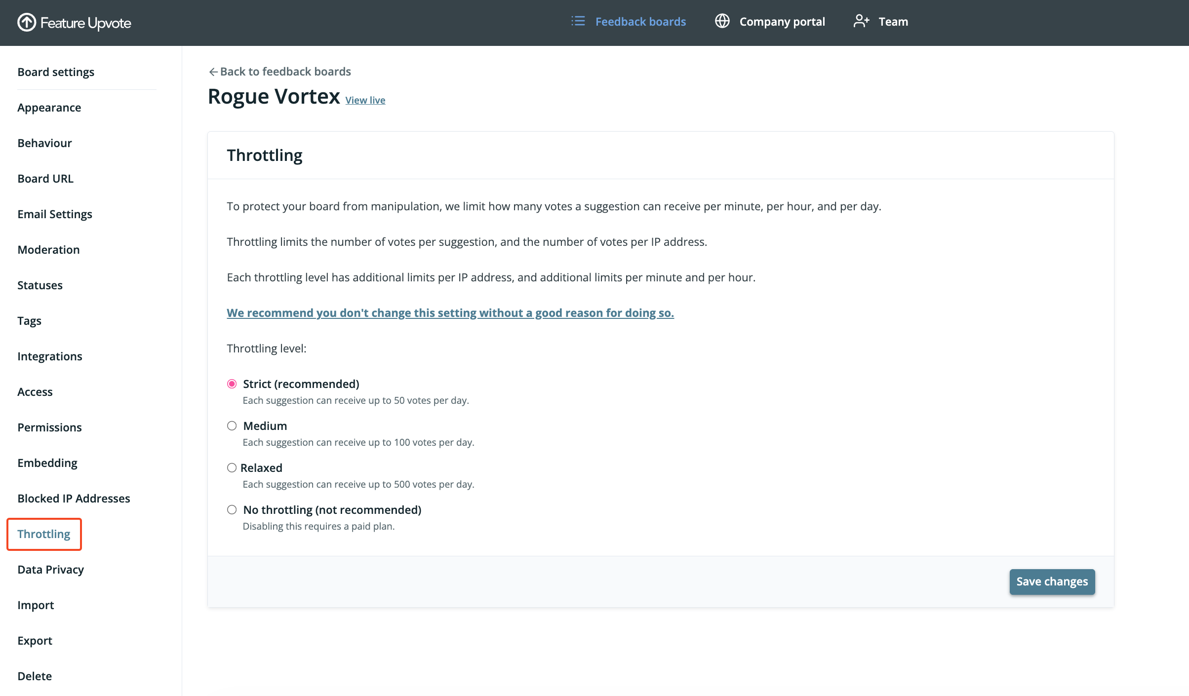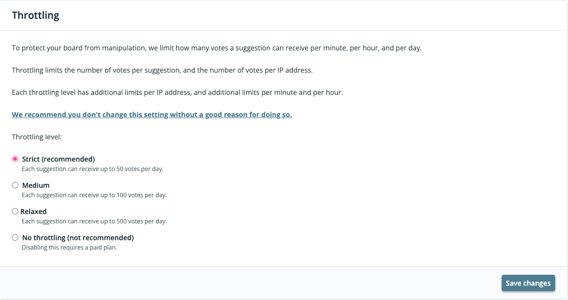 - You announce your feedback board via email newsletter or social media to a large amount of people, who are likely to arrive and vote at around the same time. You can reduce throttling on the day the email newsletter is sent or the announcement is made, then return to strict throttling the day after.