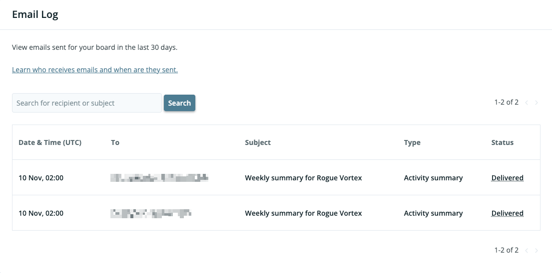 To make it easier to solve email deliverability problems, we’ve added an email log to your board’s settings. The email log shows all emails sent by Feature Upvote on behalf of your board in the last 30 days.