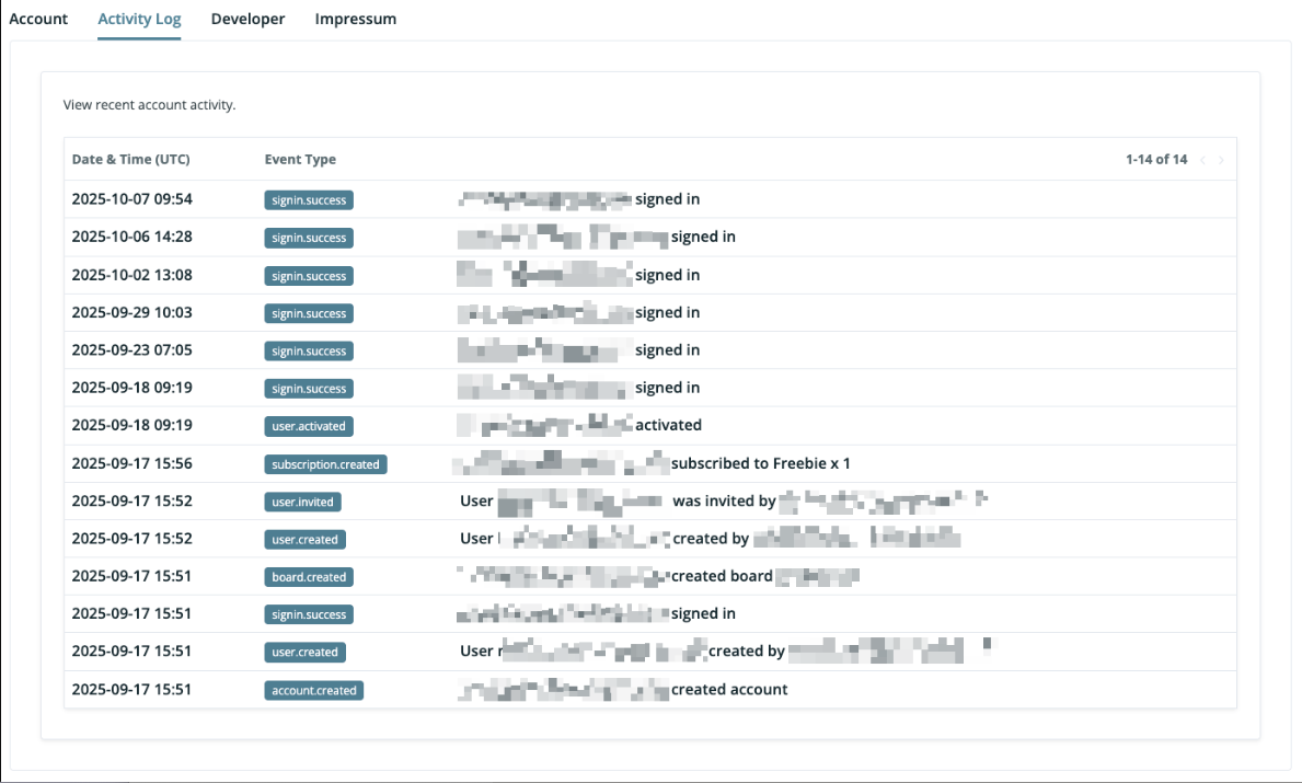 Feature Upvote's activity log is a list of everything that happens in your account that might be interesting to you as an account admin. It is an audit that helps with traceability.
